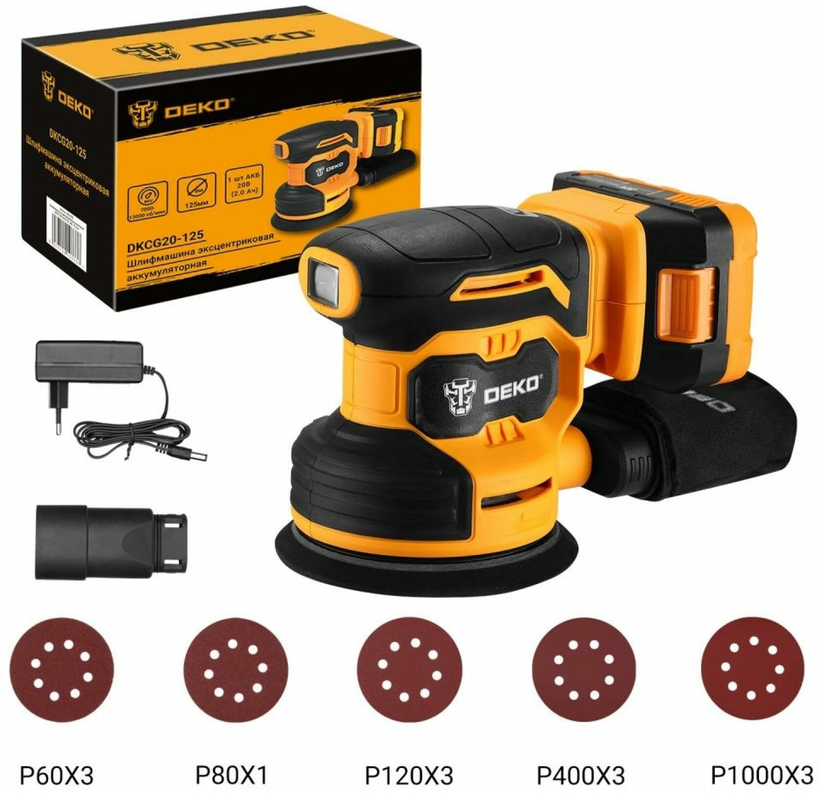 Шлифмашина эксцентриковая аккумуляторная Deko DKCG20-125, 20 В, 2 Ач Li-ion, ЗУ