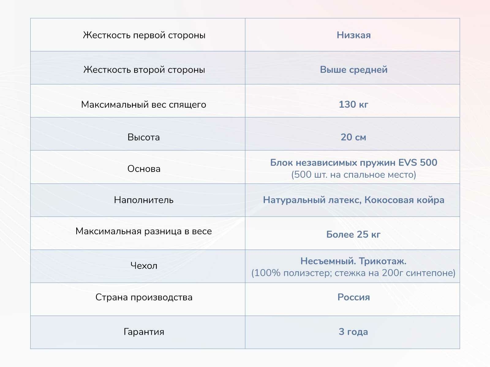 Лучшие цены. Состав: Натуральный латекс - 3 см. Мягкий, эластичный и упругий материал из вспененного сока гевеи; Термовойлок - плотный и прочный нетканый материал из смеси искусственных и натуральных волокон; Независимый блок пружин EVS 500 (около 250 шт/м2), высота* - 14 см; Термовойлок; Кокосовая койра - 2 см. Прочный и надежный натуральный материал из волокон кокосовой пальмы; ППУ по периметру. Несъемный чехол: трикотажная ткань, простеганная на синтепоне (200г); бурлет из рогожки. Уровень жесткости: низкий/высокий. Магазины в вашем городе.