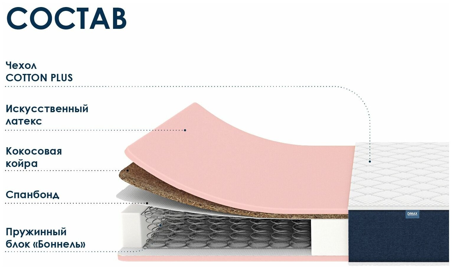Лучшие цены. Прочный каркас Основа матраса Dimax Практик Лайт Базис Bonnel - зависимый блок крепко скреплённых между собой пружин. Все края усилены плотным пенополиуретаном, удобно вставать и можно долго на них сидеть. Слой латексированной койры также добавляет прочности и увеличивает предельную нагрузку. Эластичная пена Balance Foam придает приятную мягкость поверхности. Надёжная защита Чехол сшит из жаккарда с тканным рисунком и подкладки из холлофайбера. Магазины в вашем городе.