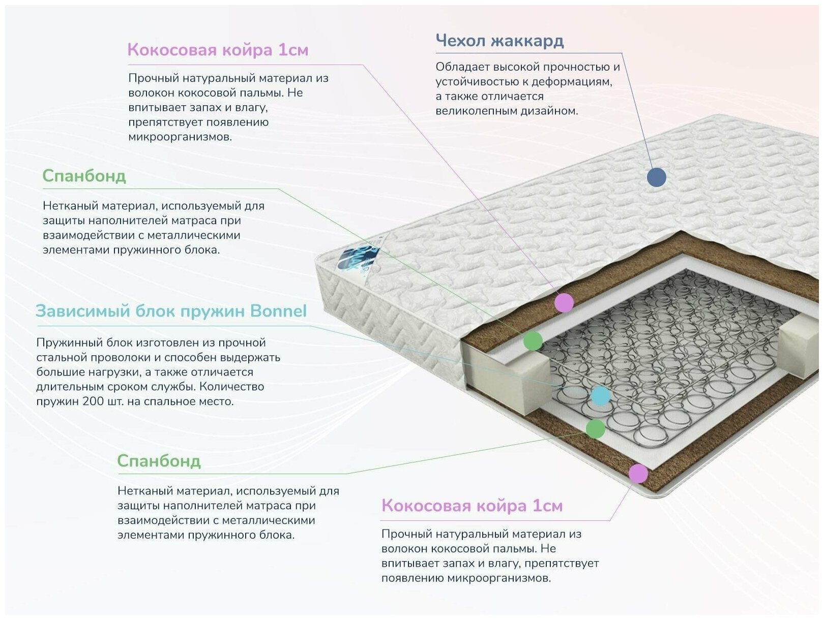 Лучшие цены. Пружинный матрас Практик Хард Bonnel является достаточно твёрдой моделью. Производитель характеризует его как изделие с жёсткостью сторон выше среднего. Такие модели предпочитают люди, беспокоящиеся о здоровой осанке. Ведь именно такой матрас отлично поддерживает спину. Наполнители: Жёсткость модели придают плиты кокосовой койры, проложенные у поверхностей. Это самая твёрдая и плотная разновидность наполнителей. Спрессованное кокосовое волокно скрепляют латексным раствором и режут на слои разной толщины. Магазины в вашем городе.