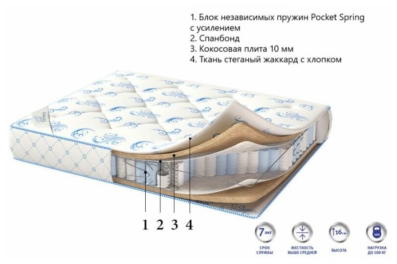 Лучшие цены. Основу модели De Luxe Coco составляет независимый блок прочных пружин Pocket Spring. Пружины размещены по поверхности с большой частотой, не скрипят и долго не выходят из строя. В матрасе использован один материал в качестве наполнения - натуральная койра кокоса. Кокосовый наполнитель пропитан латексным составом, что делает его более упругим и устойчивым к нагрузкам и деформации. Кокос прекрасно вентилируется и не скапливает пыль, влагу и посторонние запахи внутри матраса. Магазины в вашем городе.