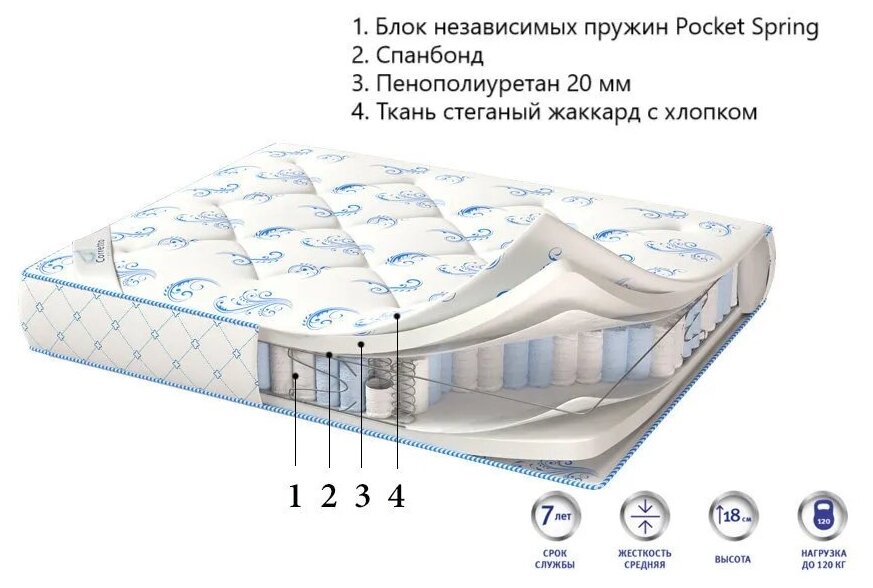 Лучшие цены. Матрас De Luxe Standart, основывается на высокопрочном автономном блоке пружин Pocket Spring. Пружины индивидуально упакованы в нетканые чехлы, точечно подстраиваются под нагрузку и не провисают в процессе эксплуатации. В качестве мягких настилочных слоев, с обеих сторон, использован упругий и пористый пенополиуретан. Материал отличается высокой гигиеничностью и безопасностью, он не вызывает аллергических реакций и не размножает болезнетворные бактерии. Магазины в вашем городе.