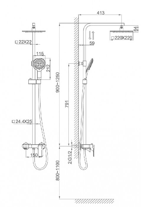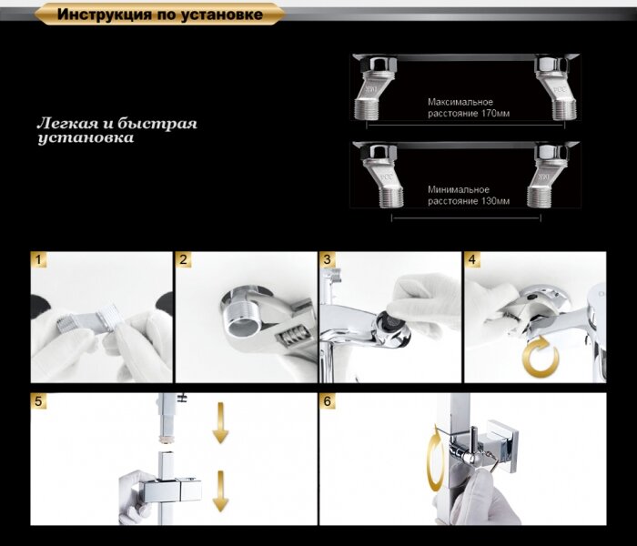 | Комплектация | ручной душ / верхний душ / смеситель / стойка / штанга / душевой шланг / крепление ручного душа / полка (в виде верхней части смесителя) |