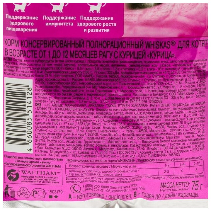 Лучшие цены. Рацион Whiskas® для котят "Рагу" — это сбалансированный рацион для здорового роста вашего малыша. Котенок с удовольствием попробует маленькие нежные кусочки с курицей в ароматном соусе. Все для замурррчательной жизни! Рационы Whiskas® для котят позаботятся об иммунитете, поддержат здоровое пищеварение и обеспечат здоровый рост и развитие. Котята активно растут и с первых дней нуждаются в правильном питании. Корм Whiskas® для котят создан с учетом всех особенностей развития организма котенка. Магазины в вашем городе.