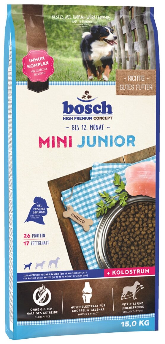 Корм Bosch Mini Junior для щенков малых пород, с домашней птицей, 15 кг
