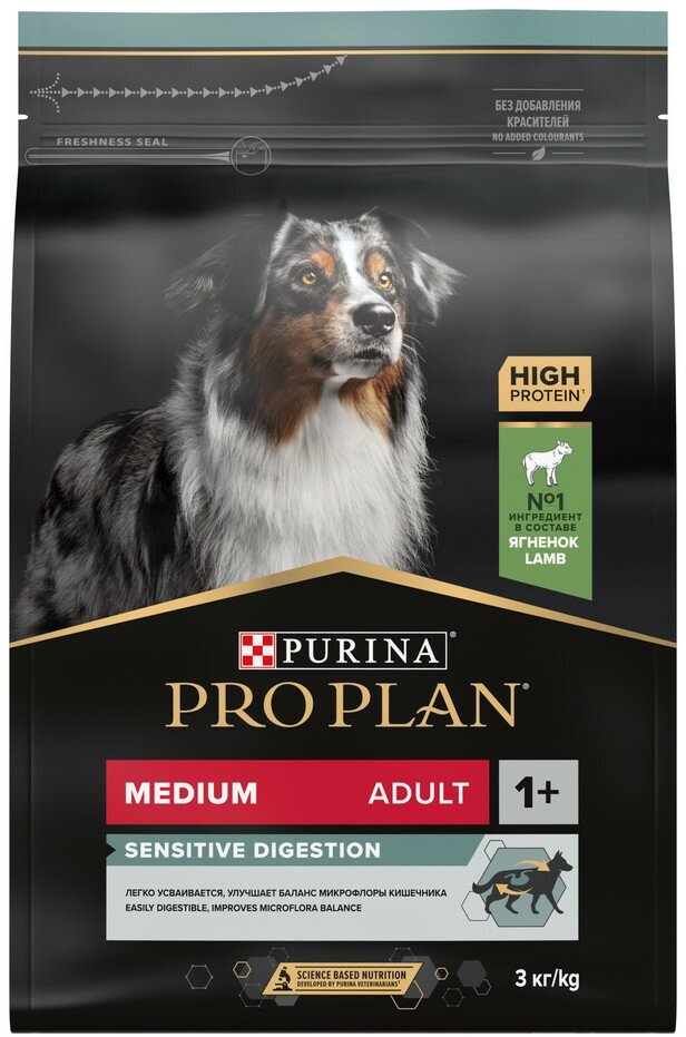 Сухой корм Pro Planдля взрослых собак средних пород с чувствительным пищеварением, с высоким содержанием ягненка, Пакет, 3 кг х 1 шт