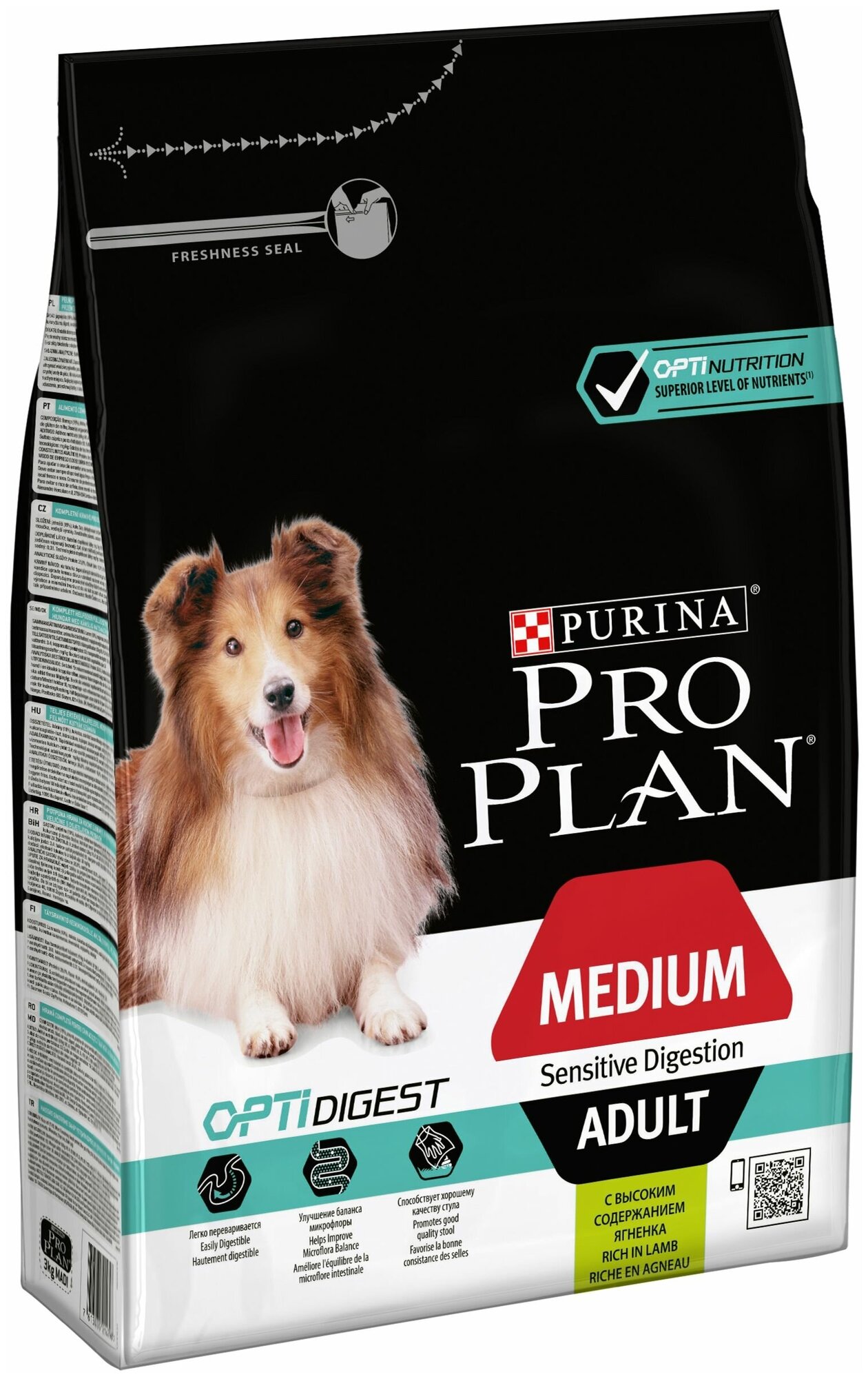 Сухой корм Pro Plan для взрослых собак средних пород с чувствительным пищеварением с комплексом OPTIDIGEST® с ягненком и рисом, Пакет, 3 кг,Для взрослых собак