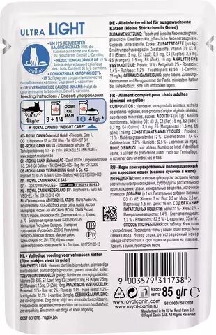 Лучшие цены. Поддержание оптимальной массы тела чрезвычайно важно для сохранения здоровья кошки, хотя иногда трудноосуществимо на практике. Особенно если кошка проявляет признаки голода даже после того, как съела рекомендуемую порцию. ROYAL CANIN® Ultra Light в желе помогает снизить потребление калорий на величину до 19% и, таким образом, снизить риск набора веса и облегчить его поддержание. L-карнитин в составе формулы стимулирует метаболизм жиров. Магазины в вашем городе.