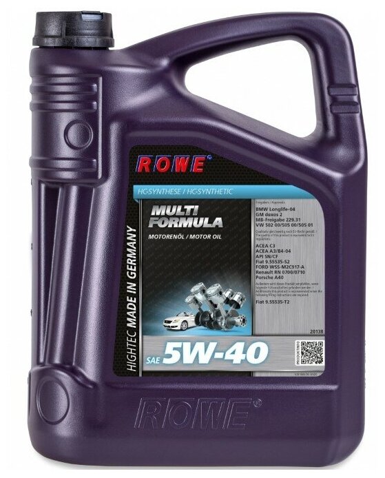ROWE 20138020099 Масло моторное ROWE HIGHTEC MULTI FORMULA 5W-40 C3 (20л) SN,Fiat 9.55535-S2,Ford WSS-M2C917-A,GM dexos2 MB 226.5, Porsche A40, Renault RN 0700/0710API CF, BMW Longlife-04, Fiat 9.55535-T2 MB-Freigabe 229.31/229.51, VW 505 00/505 01