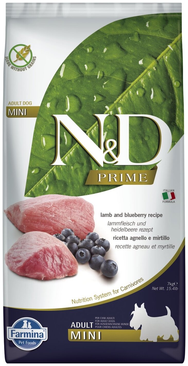 FARMINA DOG N&D PRIME ADULT MINI LAMB & BLUEBERRY беззерновой для взрослых собак маленьких пород с ягненком и черникой (7 кг)
