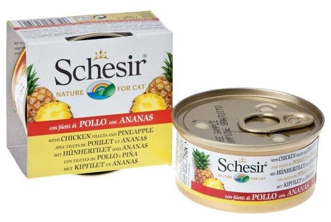 Лучшие цены. Консервы Schesir (Шезир) Цыпленок/ананас - сбалансированный корм для кошек, предназначенный для ежедневного кормления. В состав входят питательные и минеральные вещества, белки, витамины, таурин, необходимые для полноценного питания кошек. Без искусственных красителей и консервантов. Магазины в вашем городе.