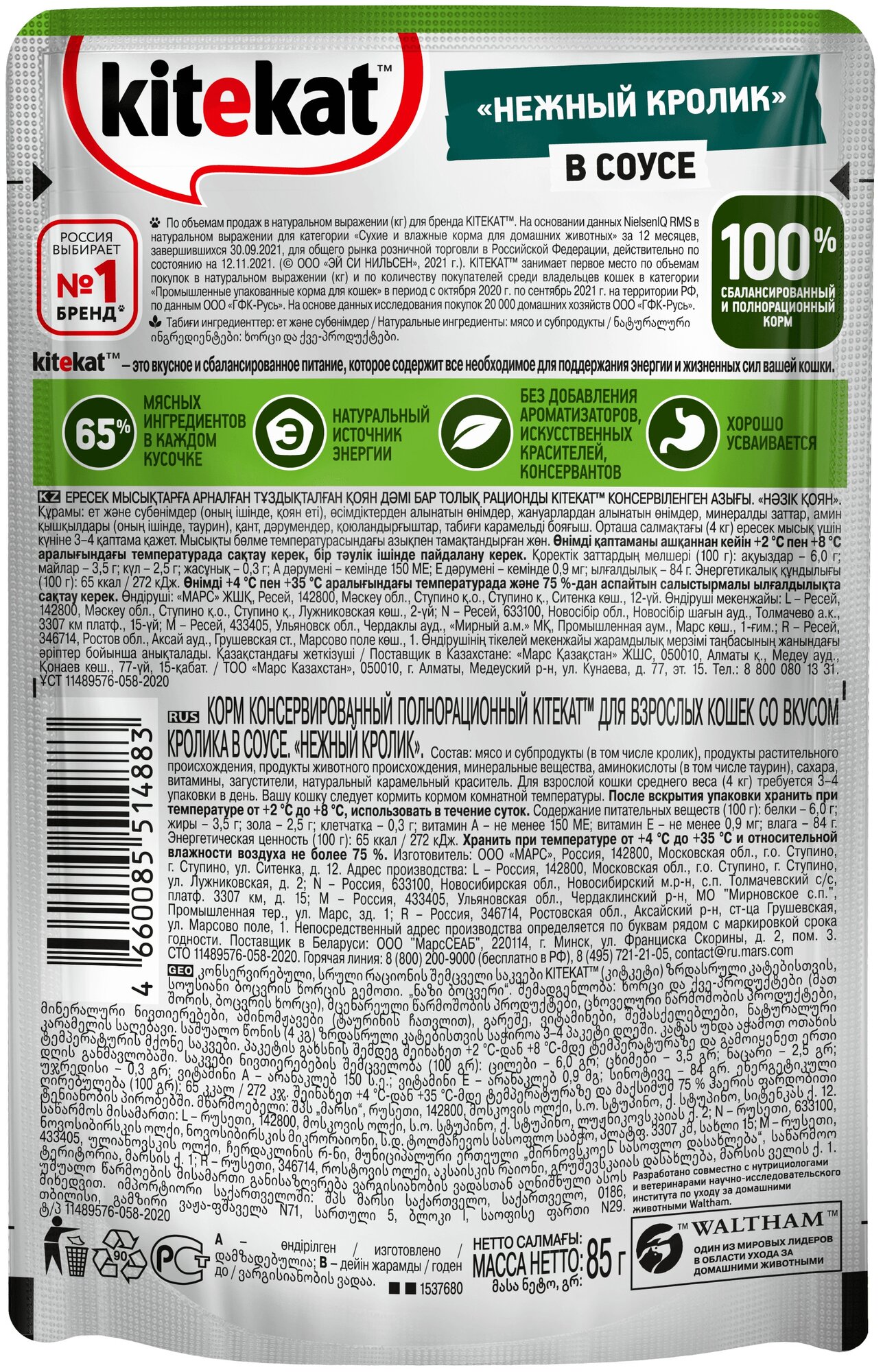 Лучшие цены. Нежный кролик – отличный выбор для обеда. Как вкусно! Кажется, ваш котик уже облизывается… Его ждет Kitekat с кроликом в соусе – порция сочных кусочков с кроликом, приготовленных по особому рецепту. В его основе – формула сбалансированного питания, которая содержит белки, минералы, витамины, таурин и животные жиры. Kitekat– это идеальный источник жизненных сил для кошки. Магазины в вашем городе.