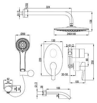 | Комплектация | ручной душ / верхний душ / смеситель / излив / душевой шланг / крепление ручного душа / настенный кронштейн |