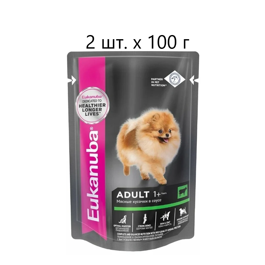 Влажный корм для собак Eukanuba Adult 1+ years, для здоровья кожи и шерсти, c говядиной, 2 шт. х 100 г (кусочки в соусе)
