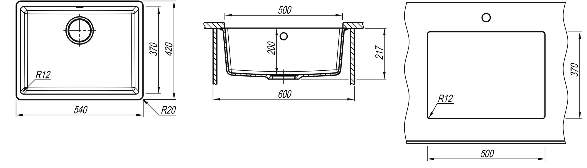 Мойка для кухни подстольная каменная Florentina ВЕГА-500, цвет антрацит, прямоугольная, 540х420х217 мм
