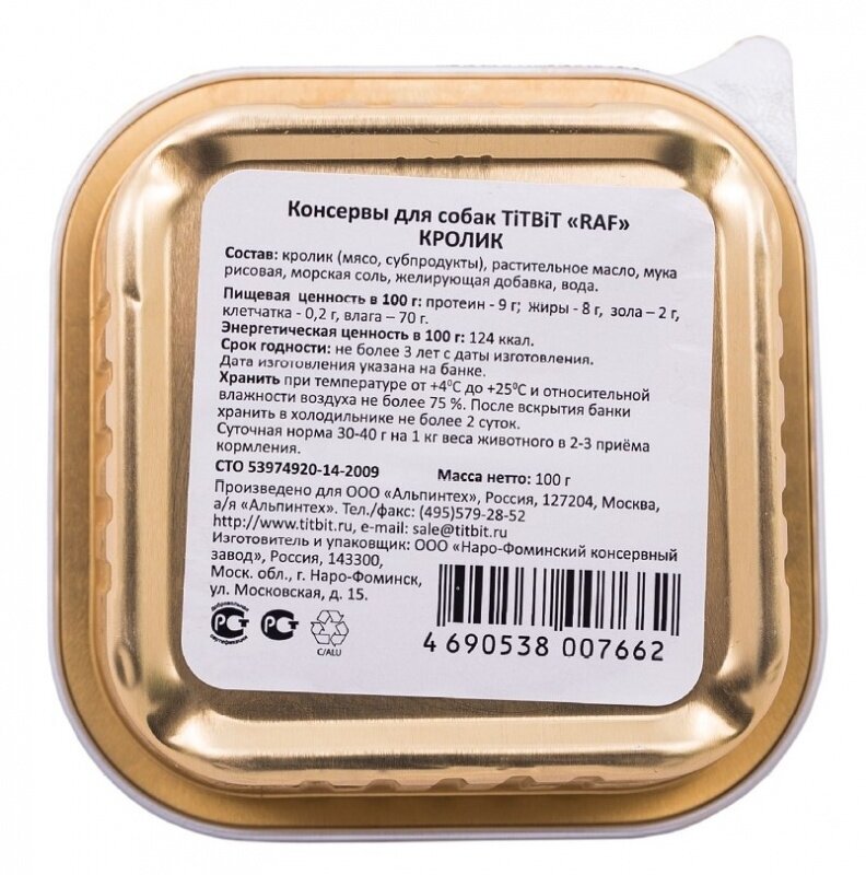 Корм для собак Консервы TiTBiT RAF для собак Кролик 100 г - ламистер