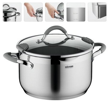 Лучшие цены. Набор посуды со стеклянными крышками, 6 пр, NADOBA, серия NITA выполнен из высококачественной нержавеющей стали 18/10. Прочное трёхслойное капсульное дно изделий служит для равномерного распределения тепла по всей площади посуды. Встроенный в крышку дуршлаг, носики на корпусе посуды, теплозащитные силиконовые держатели на крышке делают процесс слива воды максимально простым и удобным. Широкие и прочные не нагревающиеся ручки с силиконовым покрытием существенно облегчают работу с нагретой посудой. Магазины в вашем городе.