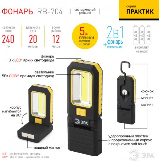 Фонарь ЭРА 5Вт COB+3xLED, поворотный 90, крючок, магниты, питание 3xAAA (не в комплекте), RB-704, Б0029179 1 шт .