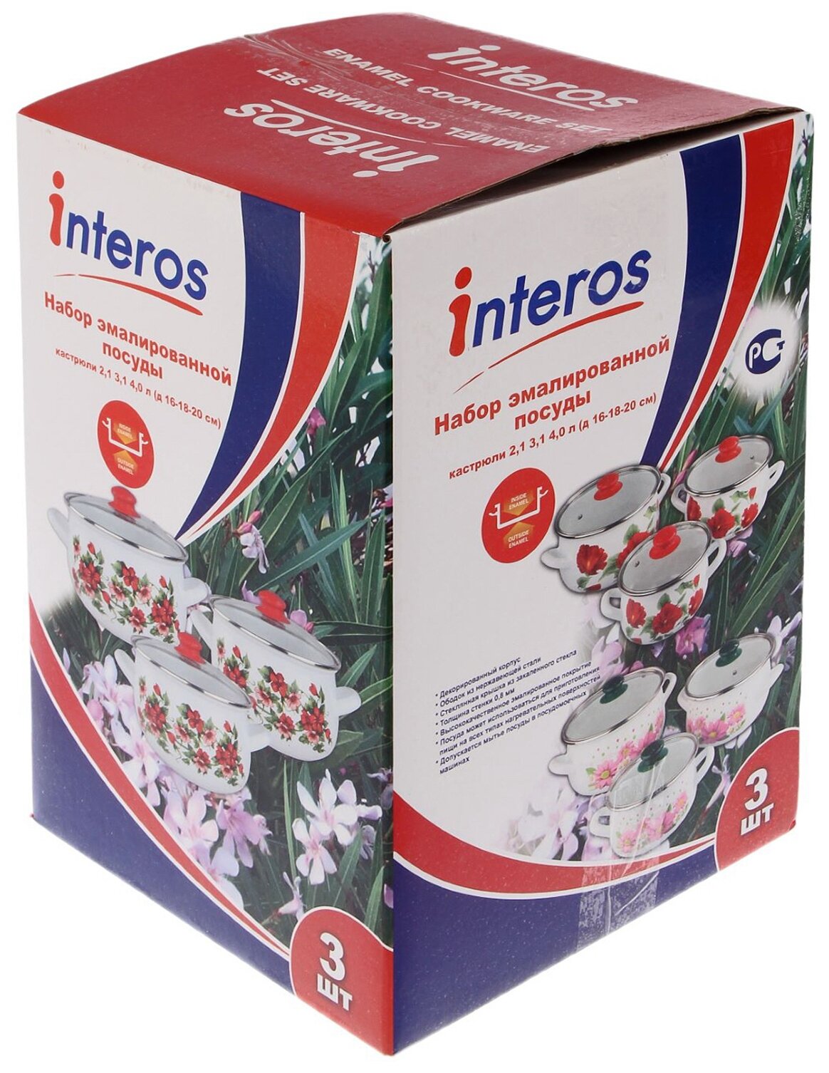 Лучшие цены. Набор эмалированных кастрюль INTEROS. В набор входит 3 кастрюли 2,1 л, 3,1 л, 4,0 л. Диаметр кастрюль 16 см, 18 см и 20 см. Крышки кастрюль выполнены из жаропрочного стекла с пароотводом. В подарочной упаковке. Декорированная эмаль. Подходит для индукционных, стеклокерамических, электрических, газовых плит. Можно мыть в посудомойке. Объем 2,1 литра диаметр 16 см, высота 10,5 см. Толщина металла 0,8 мм, двойное покрытие эмали. Объем 3,1 литра диаметр 18 см, высота 11,5 см. Магазины в вашем городе.