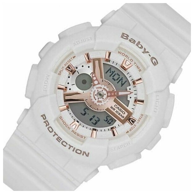 Наручные часы CASIO Baby-G BA-110RG-7A женские, кварцевые, будильник, хронограф, секундомер, таймер обратного отсчета, водонепроницаемые, противоударные, подсветка стрелок, подсветка дисплея, белый