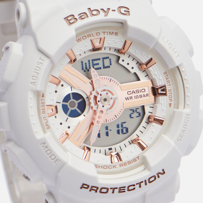 Наручные часы CASIO Baby-G BA-110RG-7A женские, кварцевые, будильник, хронограф, секундомер, таймер обратного отсчета, водонепроницаемые, противоударные, подсветка стрелок, подсветка дисплея, белый
