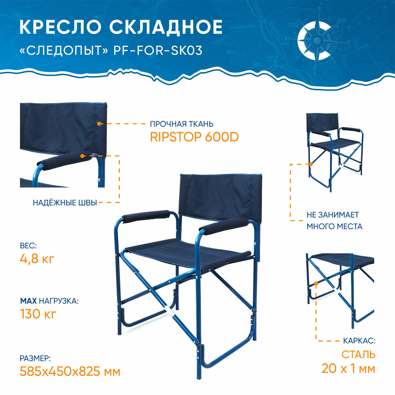 Туристическая мебель PF-FOR-SK03 Кресло складное "следопыт" 585х450х825 мм, сталь 20 мм, синий
