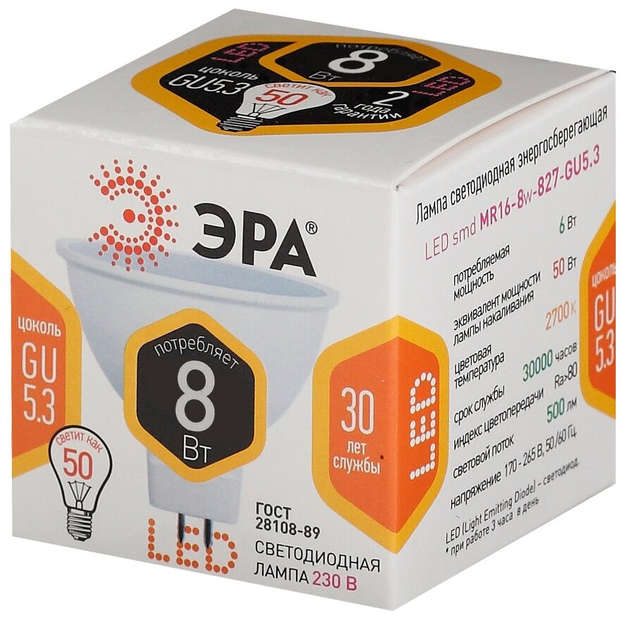 Лампочка Лампа светодиодная ЭРА STD LED MR16-8W-827-GU5.3 GU 5.3 8 Вт теплый свет, 1681846