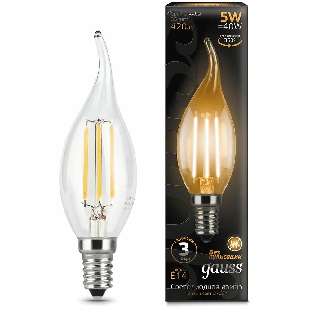 Gauss Filament Свеча на ветру E14 5W(420lm) 2700K 2K 122x35 филамент (нитевидная), прозр. 104801105 (арт. 581768)