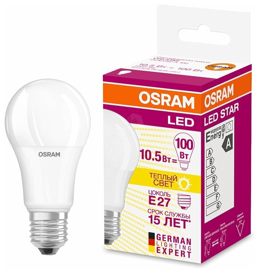 Светодиодная лампа OSRAM LED STAR A Стандарт 11,5 Вт E27 1055 Лм 2700 К Теплый белый свет 4052899971578