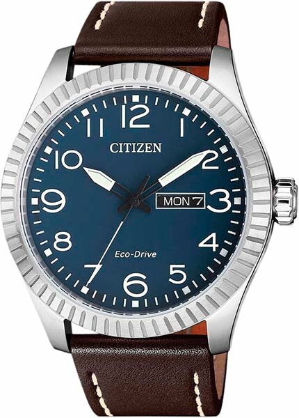 Лучшие цены. Мужские кварцевые часы с приводом Eco-Drive. Заряжаются от любого источника освещения. Запас энергии до 180 дней. Функция индикации заряда (EOL). Центральные часовая, минутная и секундная стрелки. Календарь: число, день недели. Круглый корпус выполнен из нержавеющей стали. Диаметр корпуса составляет 42 мм. Ремешок из натуральной кожи, стандартная застежка. Минеральное ударопрочное стекло, устойчивое к мелким механическим повреждениям. Водозащита WR100 (подходит для плавания). Магазины в вашем городе.