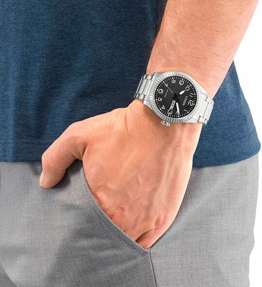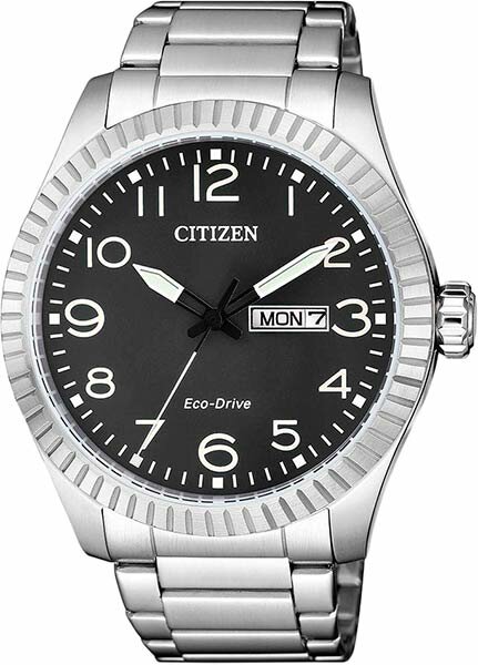 Лучшие цены. Мужские кварцевые часы с приводом Eco-Drive. Заряжаются от любого источника освещения. Запас энергии до 180 дней. Функция индикации заряда (EOL). Центральные часовая, минутная и секундная стрелки. Календарь: число, день недели. Круглый корпус выполнен из нержавеющей стали. Диаметр корпуса составляет 42 мм. Браслет из нержавеющей стали, раскладывающаяся застежка. Минеральное ударопрочное стекло, устойчивое к мелким механическим повреждениям. Водозащита WR100 (подходит для плавания). Магазины в вашем городе.