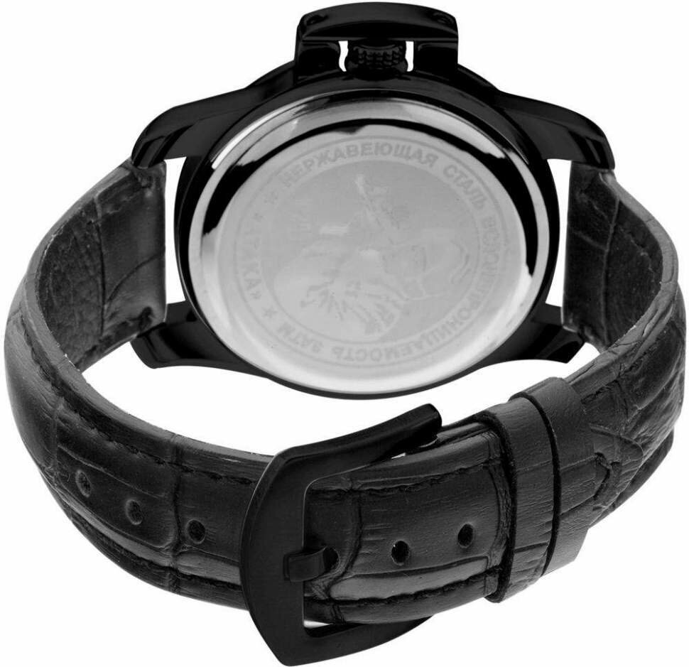 Лучшие цены. Кварцевые часы с точным японским механизмом Miyota 2115. Центральные часовая, минутная и красная секундная стрелки. Люминесцентное покрытие. Апертура даты в позиции 3 часов. Черный циферблат с гербом Российской Федерации. Арабская индикация времени. Круглый корпус выполнен из алюминиевого сплава с черным IP покрытием. Диаметр корпуса составляет 44 мм, толщина 11 мм. Заводная головка с защитой. Черный кожаный ремешок шириной 22 мм. Классическая застежка. Магазины в вашем городе.