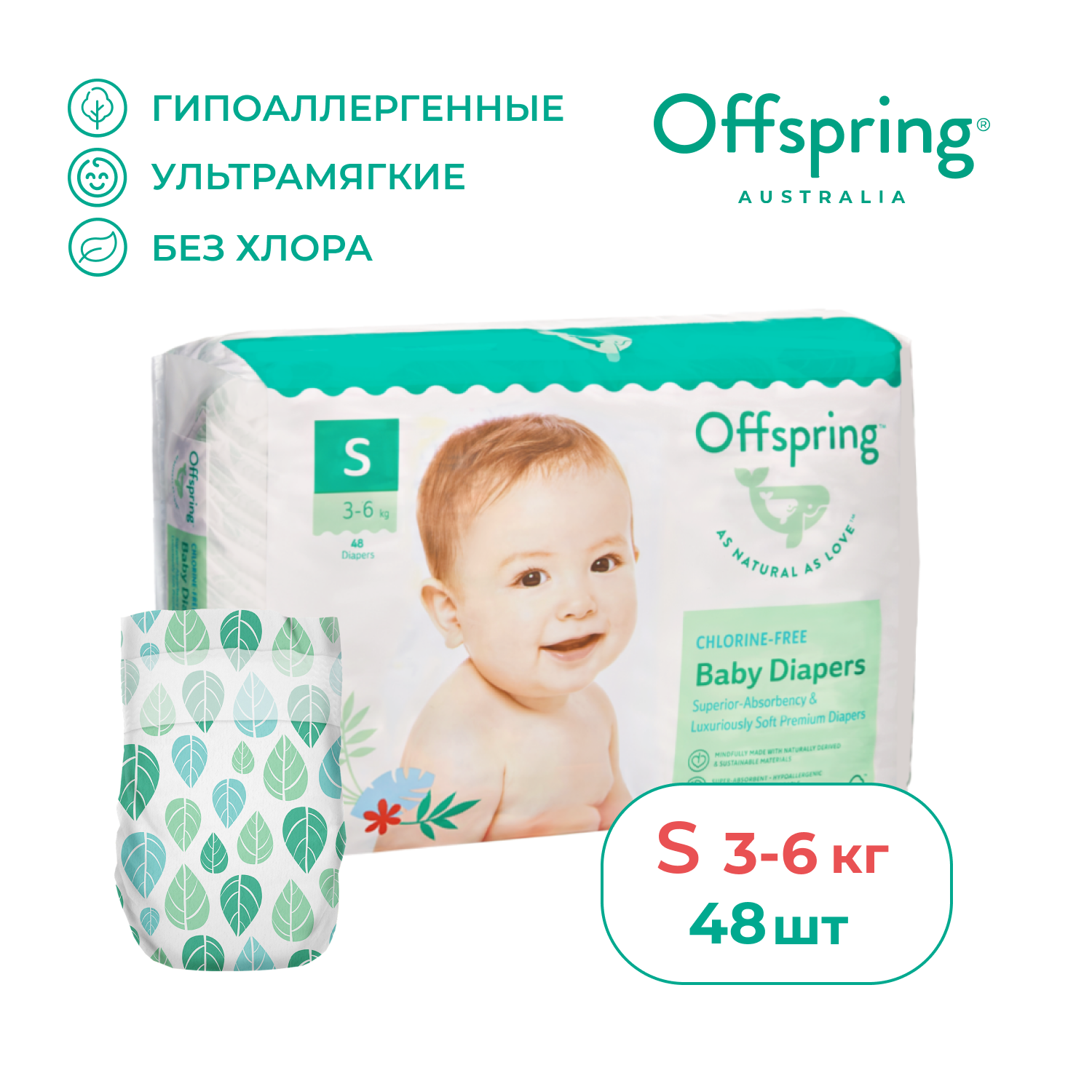 Подгузники (памперсы) Эко-подгузники Offspring, размер S 3-6 кг. 48 шт. Листочки