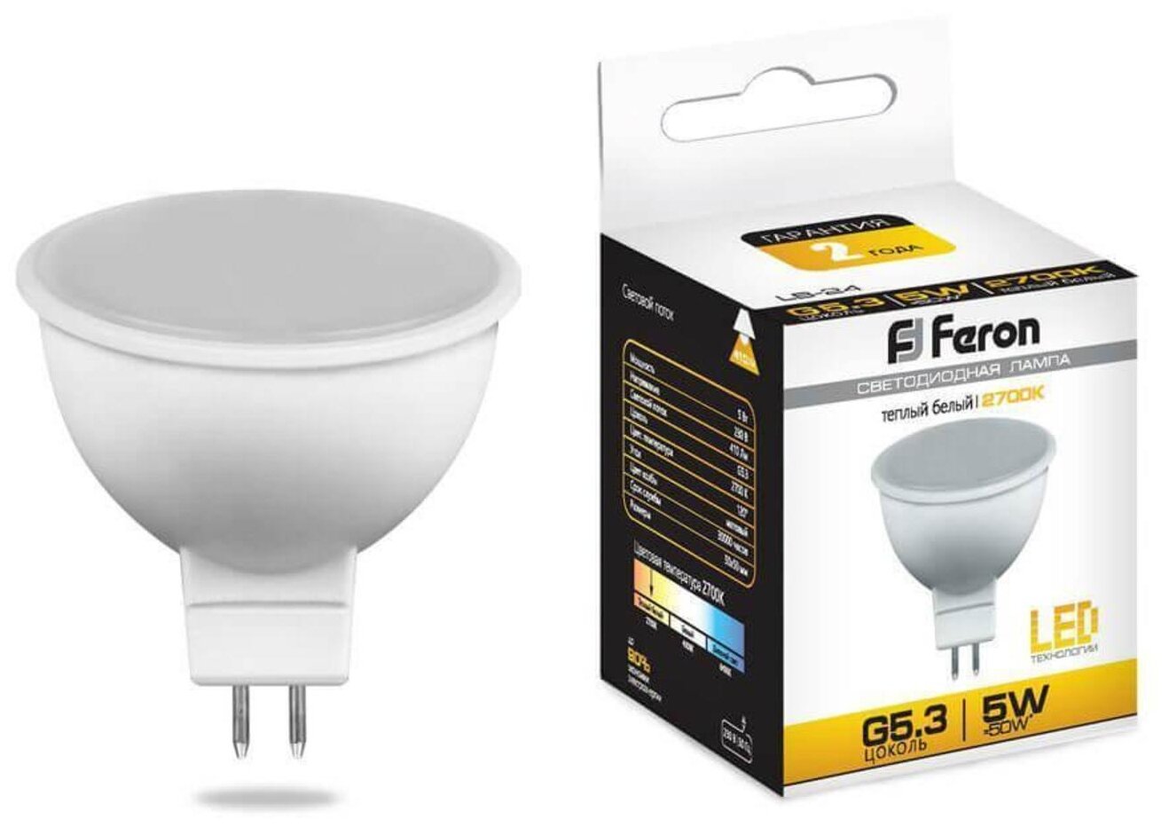 Лучшие цены. Светодиодная лампочка в форме грибка с цоколем G5.3 и размерами 60 мм по высоте обладает мощностью в 9 W, благодаря чему она может осветить 3 кв. м. Цветовая температура – 2700 К, т.е. теплый свет близкий к цвету Солнца. Ориентировочный срок службы заявленный производителем Feron составляет 30 000 ч. Изделие рассчитано на использование в сети с переменным напряжением в 230 В. Магазины в вашем городе.