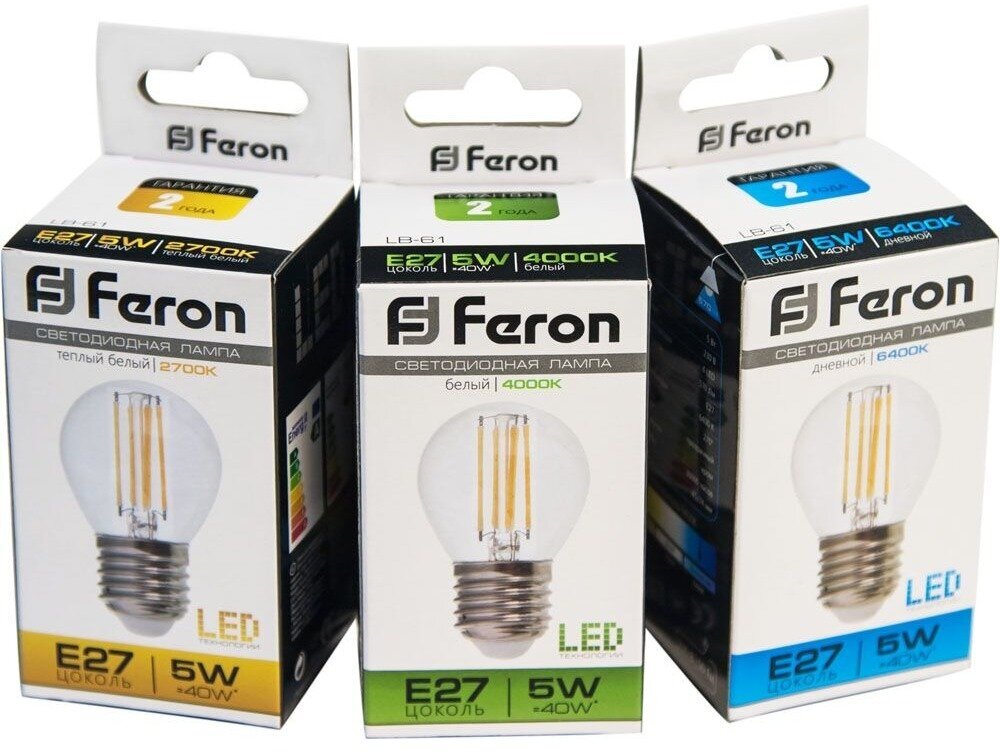 Лучшие цены. Лампа светодиодная филамент FERON LB-61, G45 (шар малый), 5W 230V E27 2700К (белый теплый), рассеиватель прозрачный 530Lm, угол рассеивания 270°, 75*45мм. Магазины в вашем городе.