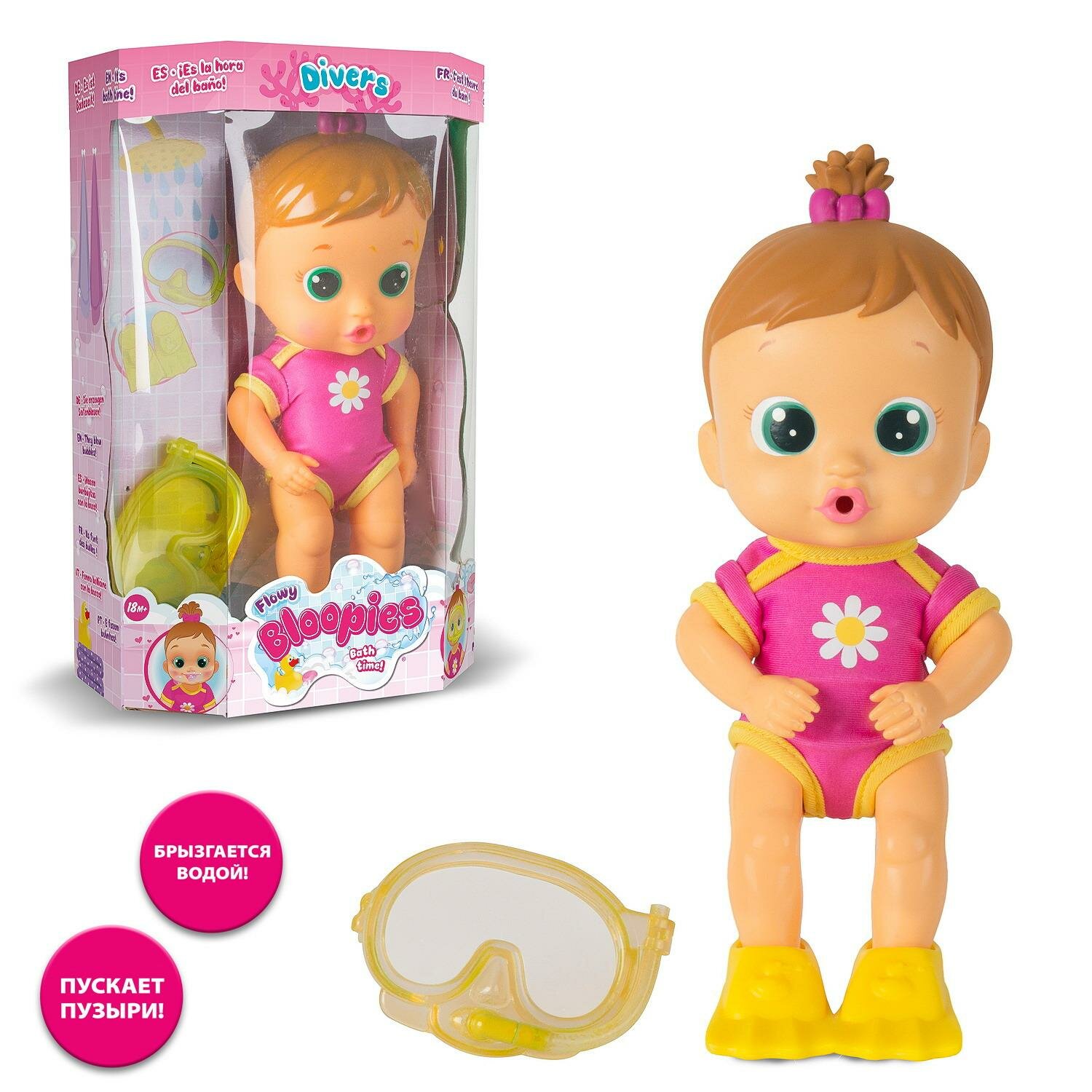 Лучшие цены. Милые малыши Bloopes (Флоуи) Флоуи - прекрасный "пловец", поместите её в воду, нажмите на её животик, вода наберется, затем повторно нажмите на живот и Флоуи начнет брызгаться водой изо рта, а если надеть маску, то через трубку в маске. Поместив малыша в воду с пеной, и проделав все тоже, что и в обычной воде, Флоуи будет пускать пузыри. В наборе - Кукла ПВХ - Маска - Ласты Внимание! Костюм у куклы не снимается. Магазины в вашем городе.