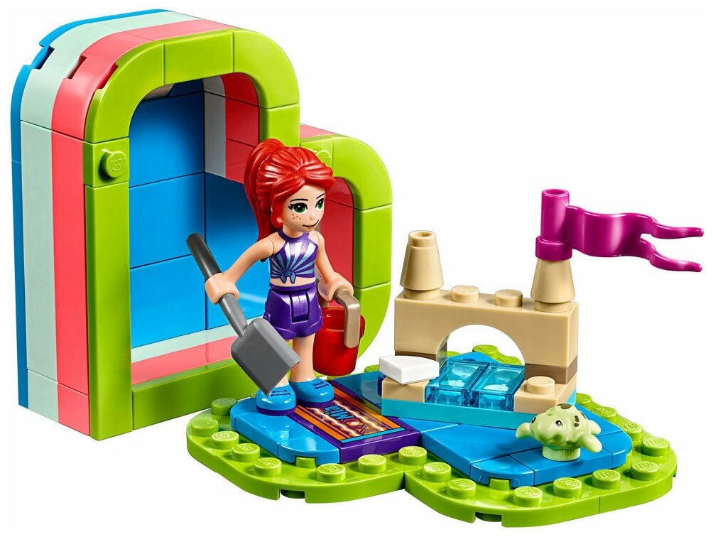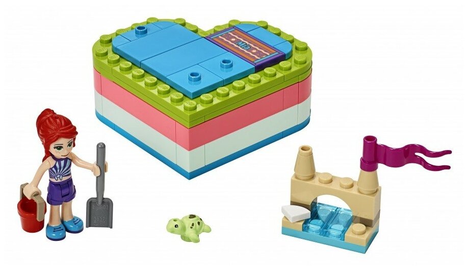 Лучшие цены. В летней шкатулке-сердечке для Мии LEGO Friends вы найдёте прелестный замок из песка, который Мия строит для маленькой черепашки. Шкатулка, выполненная в цветах Мии, украшена декоративным элементом в виде пляжного полотенца с её именем. Персонажи могут стоять на крышке, когда они будут строить воображаемый домик для черепахи. Внутри шкатулки вы найдёте голубое основание из плиток, напоминающее море. Ребёнок сможет представить, как Мия и черепаха плещутся в воде после тяжёлой работы по постройке домика. Магазины в вашем городе.