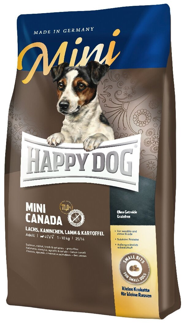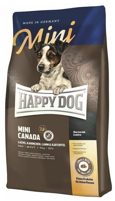 Лучшие цены. Для взрослых собак мелких пород весом до 10 кг с повышенными потребностями в энергии и для чувствительных к корму собак. На основе лосося, кролика и ягненка с картофелем. Корм, не содержащий злаков, оптимально подходит для чувствительных собак. Корм Happy Dog Mini Canada разработан специально для взрослых собак мелких пород. В состав исключительно вкусного полнорационного корма Mini Canada входит нежное мясо лосося, вкусное мясо кролика и ягнёнка, а также картофель, не содержащий глютена.Уникальный комплекс. Магазины в вашем городе.