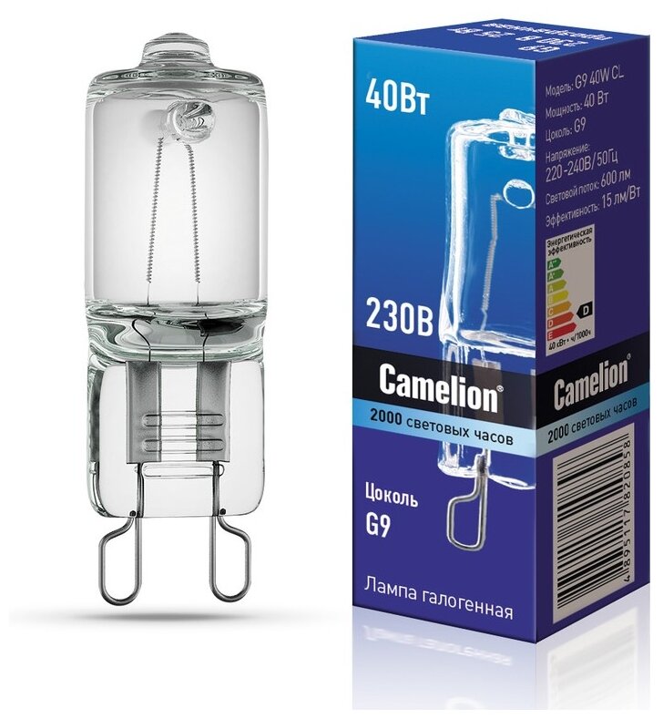 Лучшие цены. Галогенная лампа без рефлектора G9 40W 220V Camelion 5553 - малый источник освещения для совместной эксплуатации с точечным светильником, имеющим подходящий тип цоколя. Не требует дополнительного трансформатора напряжения и подключается напрямую к сети 220 В. Магазины в вашем городе.