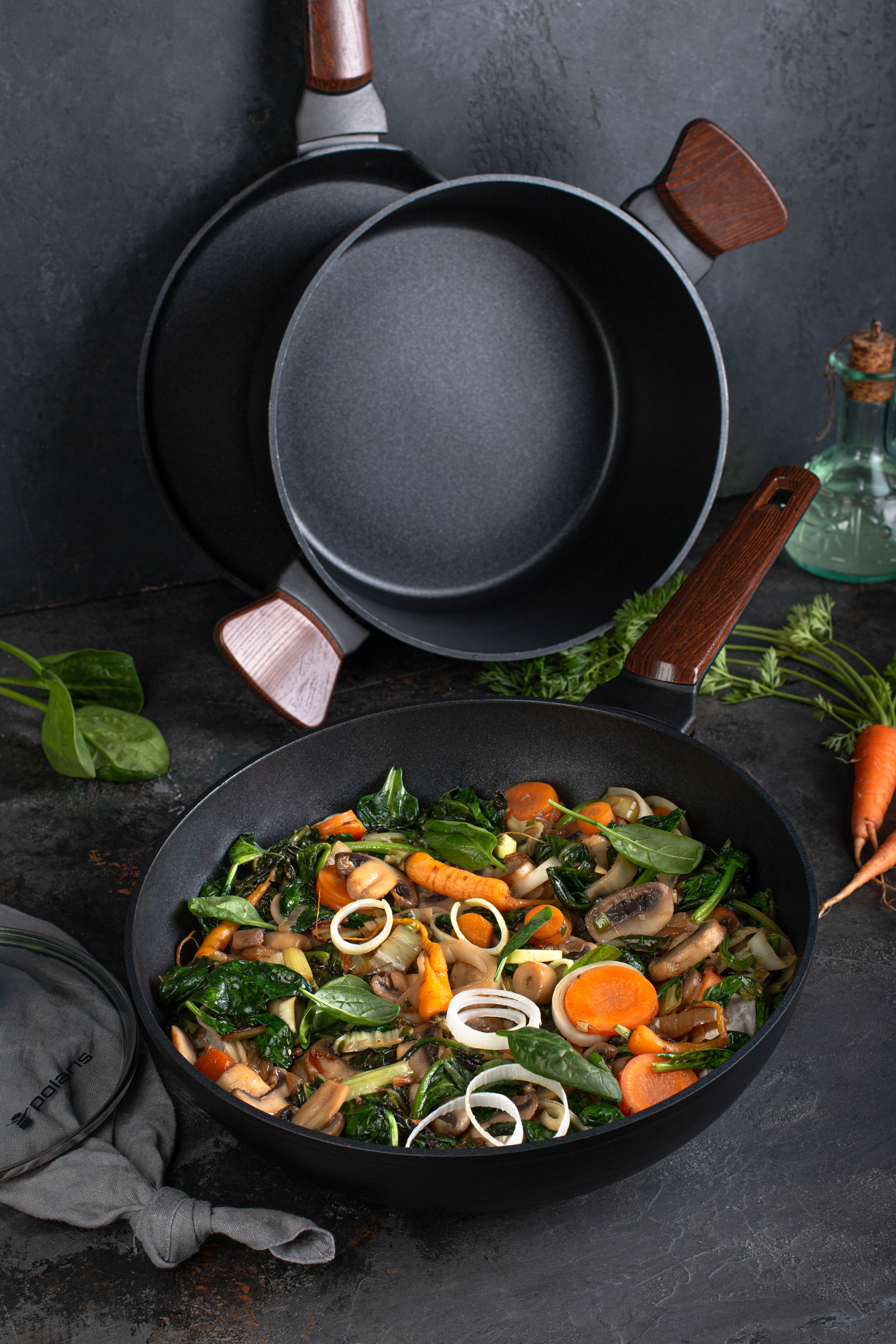 Лучшие цены. Дизайн стилизован под дерево. Посуда изготовлена из высококачественного кованого алюминия. Толщина алюминия 3. 5 мм. Внутреннее высокопрочное утолщенное антипригарное покрытие Pfluon. Термостойкое внешнее покрытие. Эргономичная бакелитовая ручка с покрытием Soft Touch не нагревается и не скользит. Крышка из жаропрочного стекла с отверстием для выпуска пара. Подходит для всех типов плит, включая индукцию. Надежная и удобная посуда для ежедневного использования. Легко мыть, приятно готовить. Магазины в вашем городе.