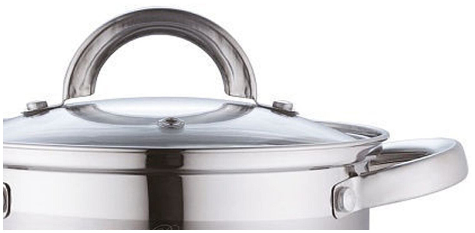 Лучшие цены. Набор посуды 6 предметов. Стеклянные крышки с паротводом. Состав: Кастрюля с крышкой Ø18х11.5см – 2.9л; Ø20х12.5см – 3.9л; Ø22х13.5см – 5,0л. Капсулированное дно. Подходит для всех видов плит(включая индукционную) и для духового шкафа. Внутренняя и внешняя зеркальная полировка. Магазины в вашем городе.