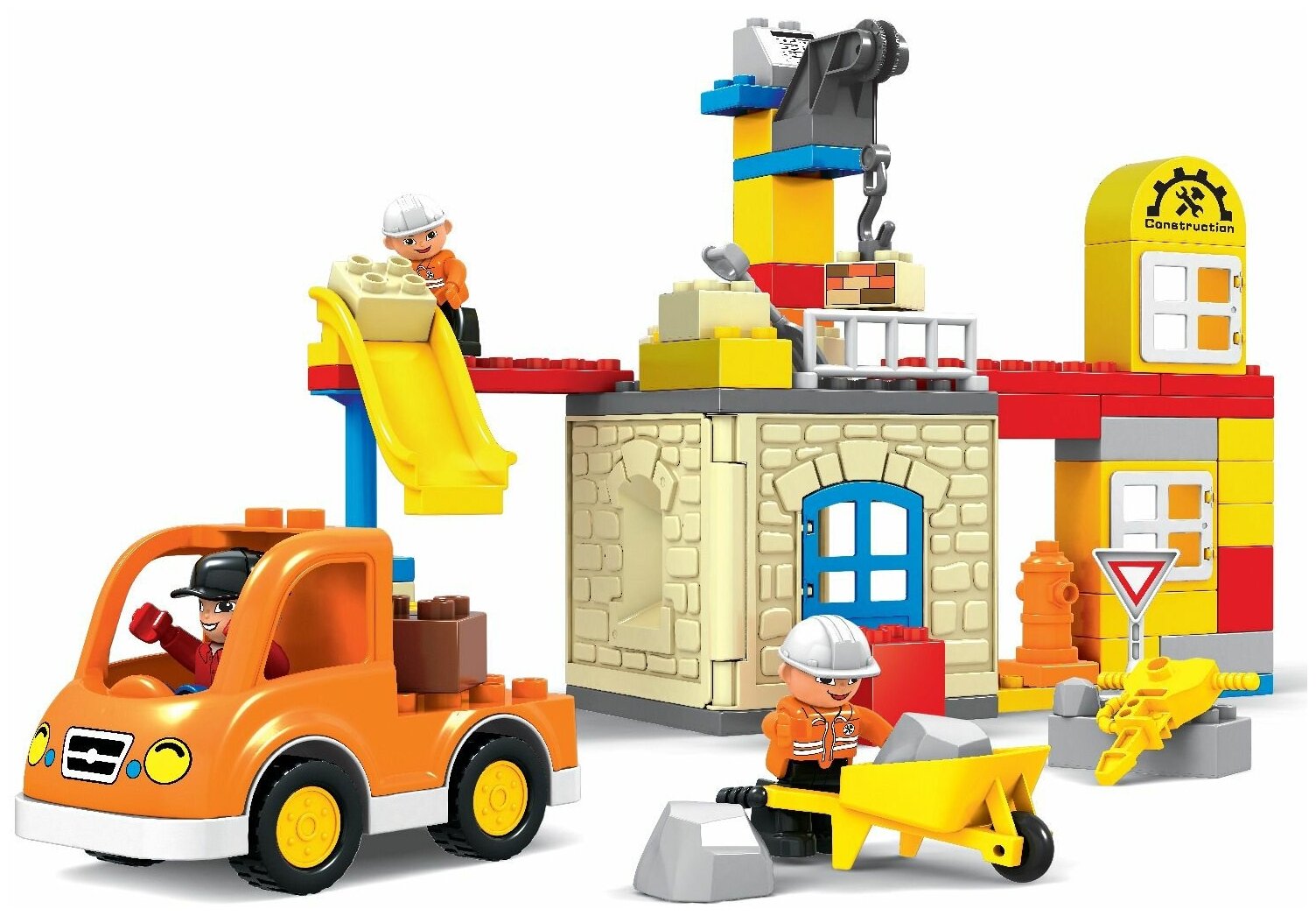 Лучшие цены. Конструктор "Стройка" станет любимой игрушкой любого мальчика! Ведь в наборе есть 2 фигурки строителя, строительный грузовик, подъемный кран, двухэтажная строительная база и многие другие яркие и интересные аксессуары, без которых нельзя обойтись ни на одном строительстве. Веселая игра даст первые представления о пространственном восприятии, логике и творческом мышлении. Детали конструктора Bondibon полностью совместимы с деталями конструкторов мировых производителей. Магазины в вашем городе.