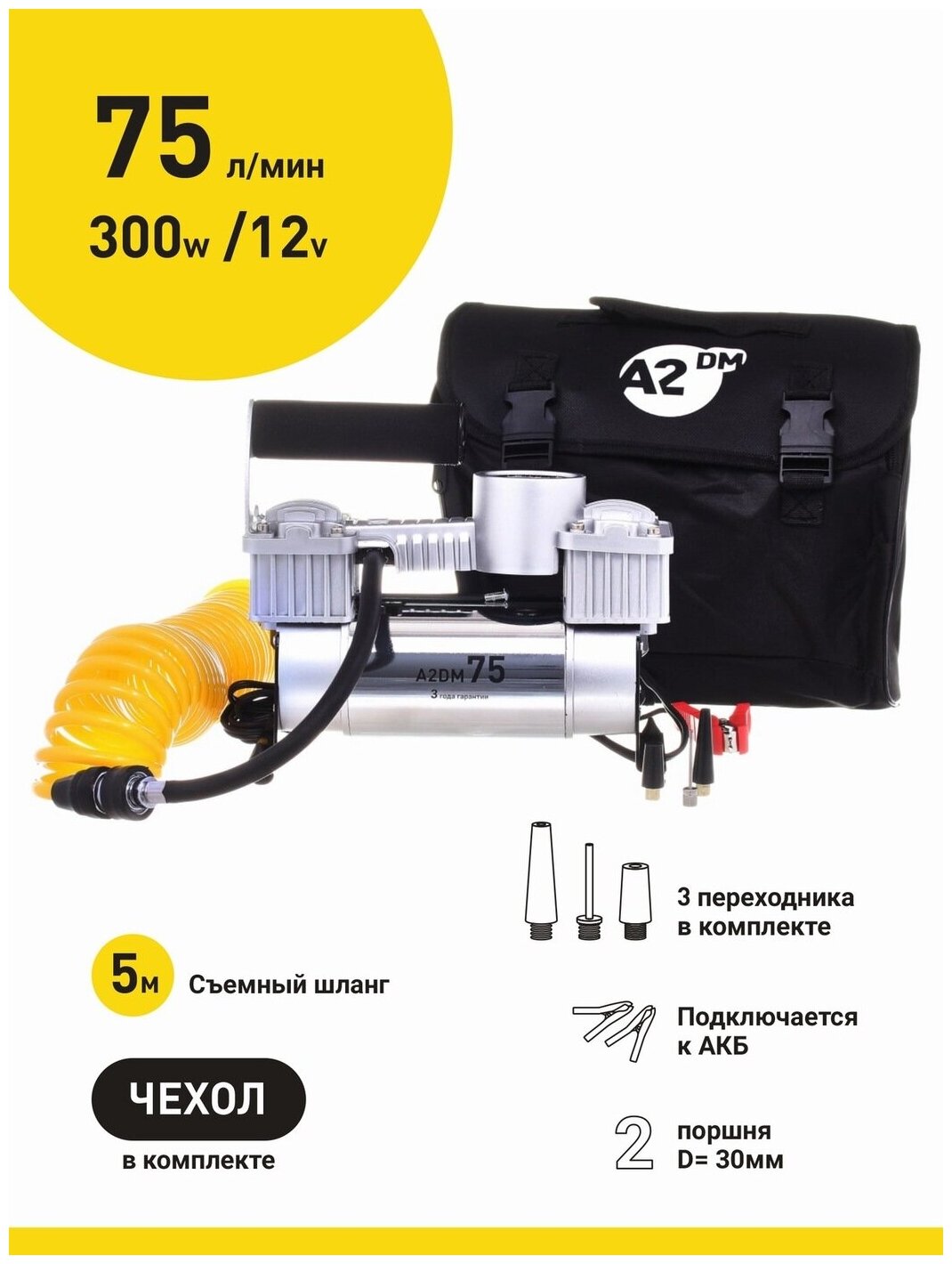 Насосы и компрессоры Компрессор Автокомпрессор автомобильный двухпоршневой A2DM 75, 75л/мин, 12В/30А, 10Атм, 300Вт, съемный шланг 5м, от АКБ, переходники 3 шт, сумка Автомобильный насос / Двухцилиндровый компрессор для автомобильных шин