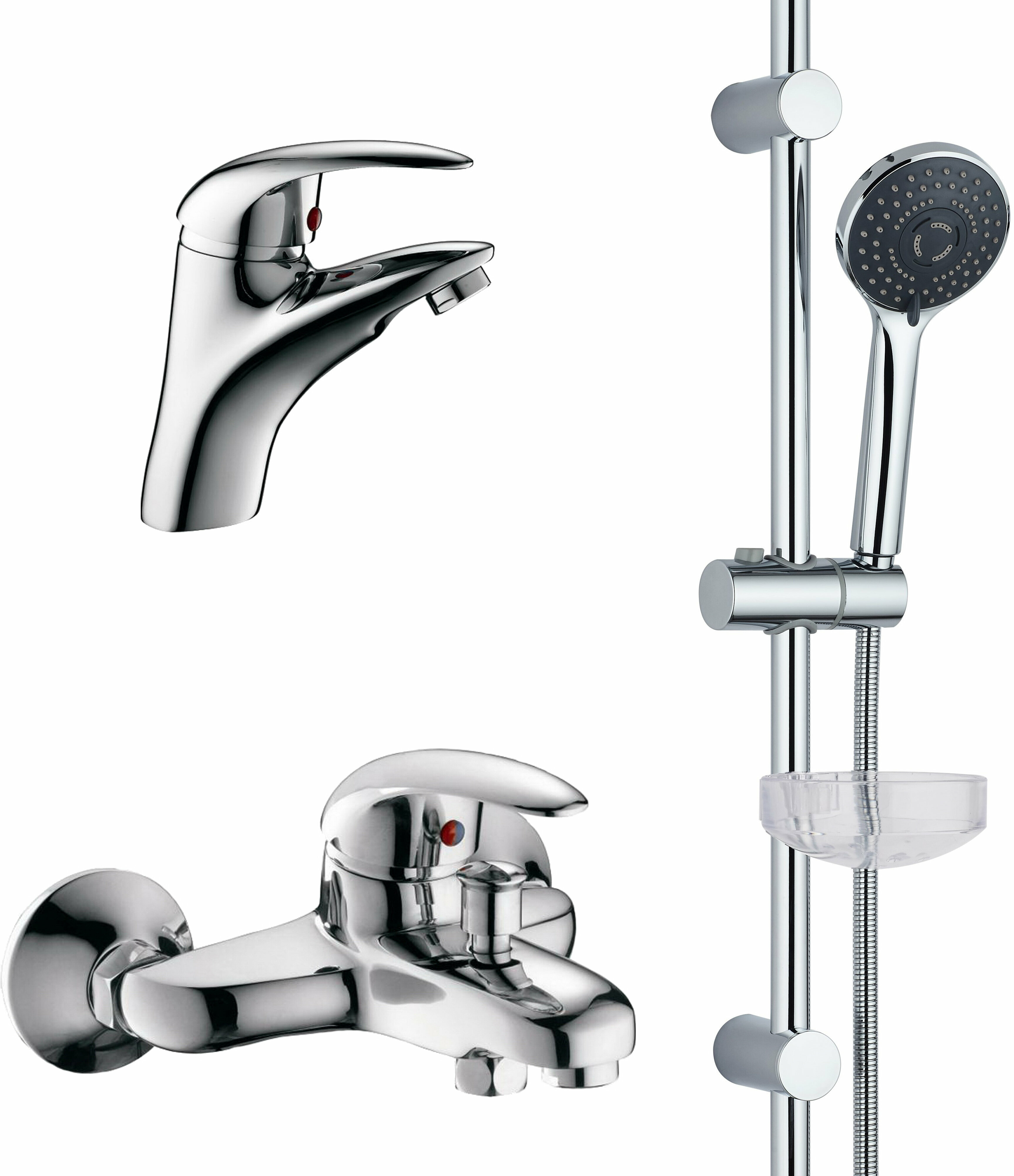 | Комплектация | смеситель для умывальника, смеситель для ванны и душа, душевой гарнитур, стойка, мыльница |