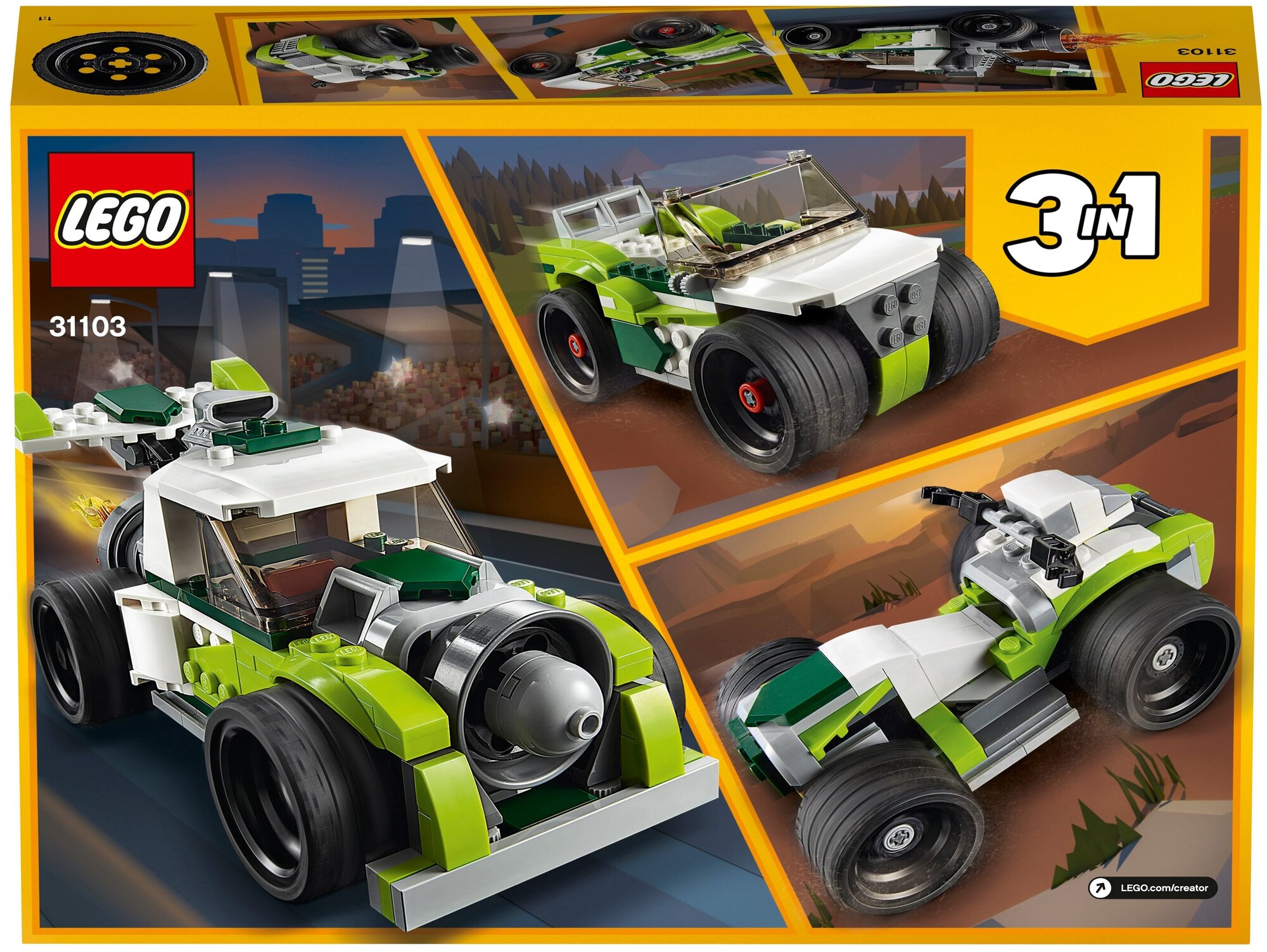 Лучшие цены. Пробудите воображение маленьких автолюбителей с помощью набора «Грузовик-ракета» LEGO Creator 3 в 1 (31103). Детям понравится расширять границы возможного с этим набором для сборки зелено-белого грузовика с установленным сзади реактивным двигателем, воздухозаборником и регулируемым спойлером. Из этого набора LEGO Creator 3 в 1 дети смогут собрать три различные игровые модели. Магазины в вашем городе.