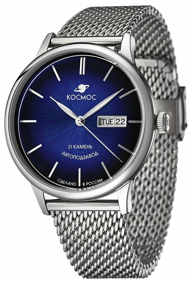 Лучшие цены. Часы наручные Космос K 043.10.36. Полированный корпус из высоколегированной стали надежно защищает автоматический механизм часов Космос. Силуэт модели, в профиль напоминающий летающую тарелку, складывается из выгнутого циферблата и минерального стекла оригинальной сферической формы. Особую глубину циферблату насыщенного синего цвета придает эффект градиента. Индикация часов и минут обеспечивается хорошо читаемыми стрелками. Секундная стрелка выгнута и вторит форме циферблата. Магазины в вашем городе.