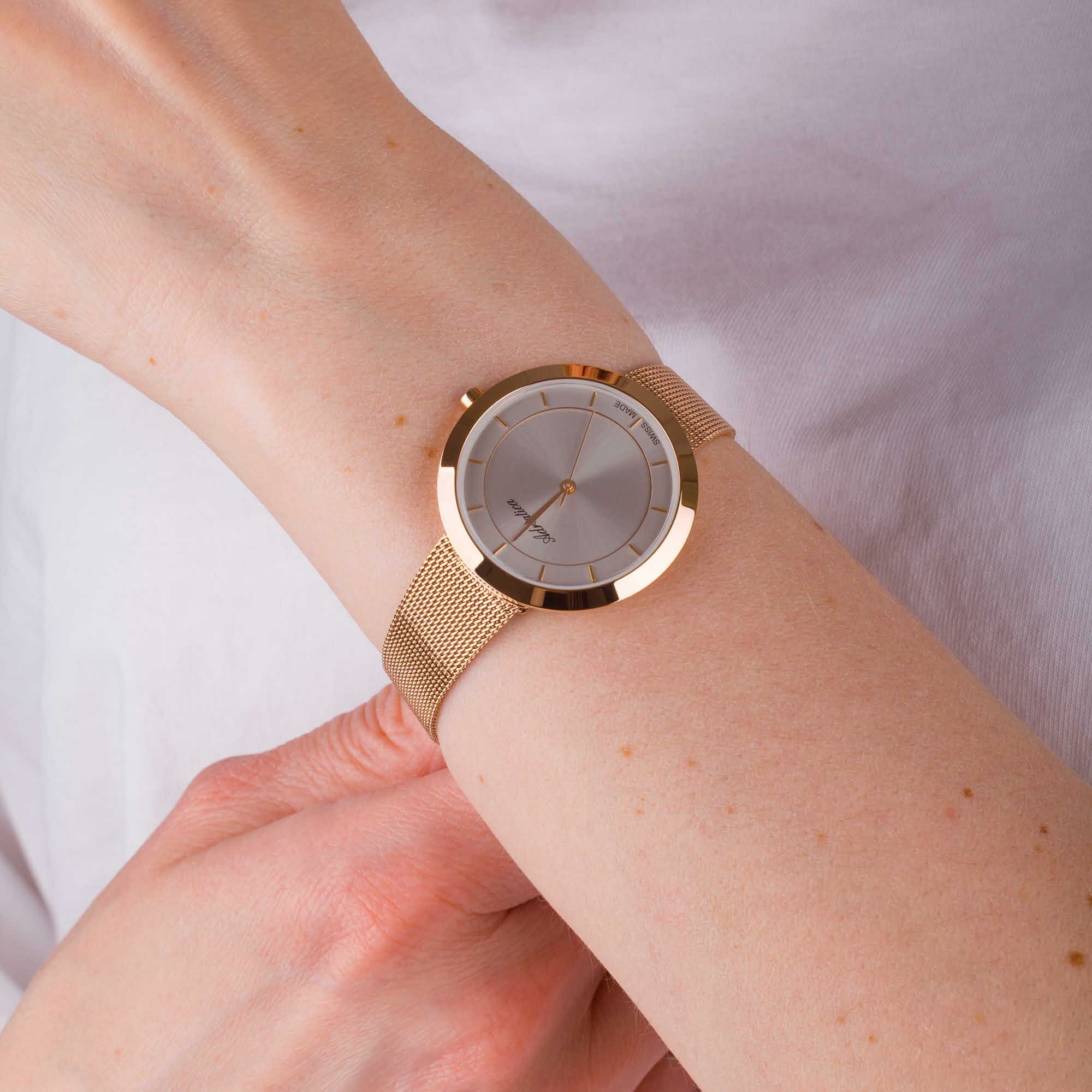 Лучшие цены. Женские кварцевые часы. Центральные часовая, минутная и секундная стрелки. Круглый корпус выполнен из нержавеющей стали. Диаметр корпуса составляет 35 мм. Стальной браслет, техника миланского плетения, раскладывающаяся застежка. Ударопрочное минеральное стекло устойчивое к мелким механическим повреждениям. Водозащита WR30 (брызги, дождь). Магазины в вашем городе.