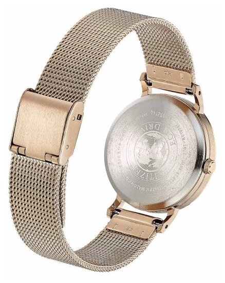 Лучшие цены. Женские кварцевые часы. Система Eco-Drive не требующая замены батарейки. Калибр механизма Citizen E031. Запас хода 180 дней. Функция индикации заряда. Светло-серебристый циферблат украшен кристаллами. Центральные часовая, минутная и секундная стрелки. Круглый корпус выполнен из матовой нержавеющей стали с PVD покрытием цвета желтого золота. Диаметр корпуса составляет 30 мм, толщина 7,5 мм. Стальной браслет с покрытием выполнен в технике миланского плетения, раскладная застежка. Магазины в вашем городе.