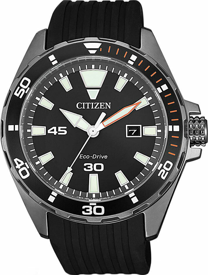 Лучшие цены. Мужские кварцевые часы с приводом Eco-Drive. Заряжаются от любого источника освещения. Запас энергии до 180 дней. Функция индикации заряда (EOL). Центральные часовая, минутная и секундная стрелки. Календарь: число. Круглый корпус выполнен из нержавеющей стали. Диаметр корпуса составляет 44 мм. Ремешок из износостойкого каучука, стандартная застежка. Минеральное ударопрочное стекло, устойчивое к мелким механическим повреждениям. Водозащита WR100 (подходит для плавания). Магазины в вашем городе.