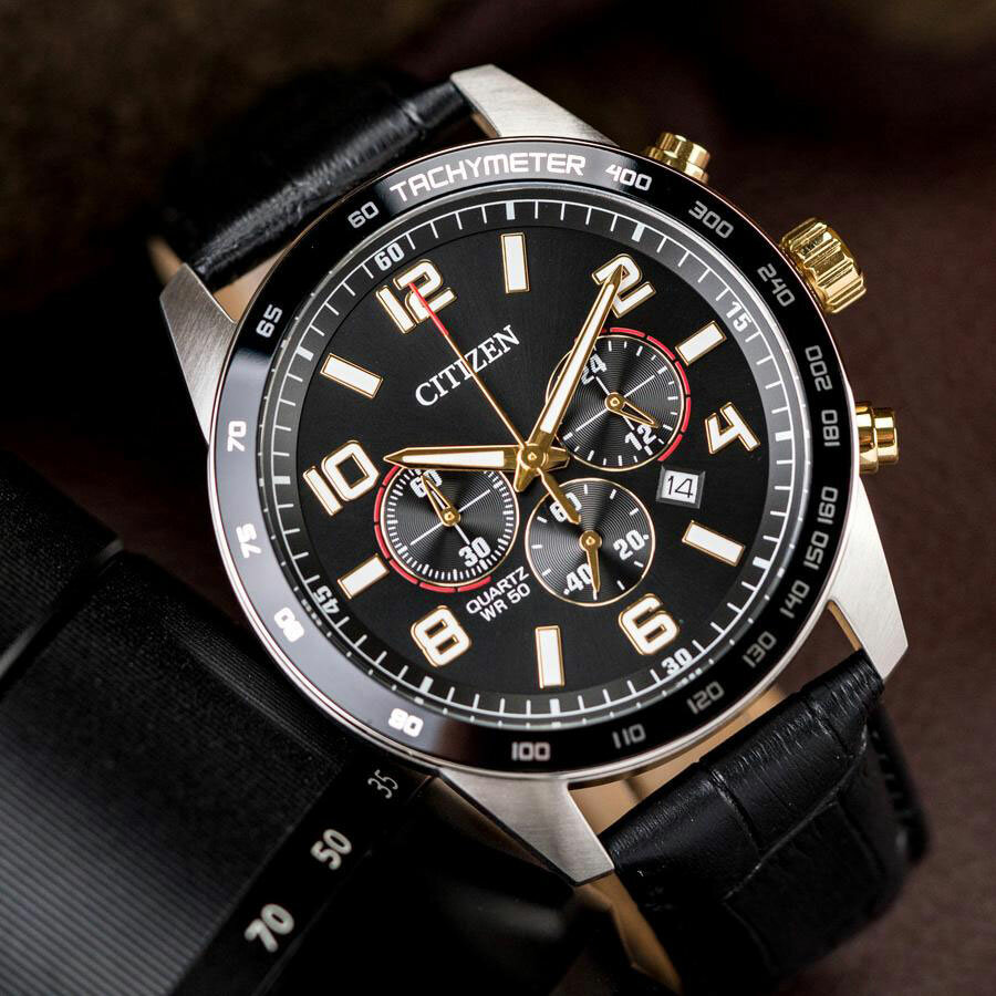 Лучшие цены. Мужской кварцевый хронограф. Центральные часовая, минутная и секундная стрелки. Люминесцентное покрытие стрелок и маркеров часов. Календарь: число. Тахиметрическая шкала. Круглый корпус выполнен из нержавеющей стали. Диаметр корпуса составляет 44 мм. Ремешок из натуральной кожи, стандартная застежка. Минеральное ударопрочное стекло, устойчивое к мелким механическим повреждениям. Водозащита WR50 (мытье рук, дождь). Магазины в вашем городе.